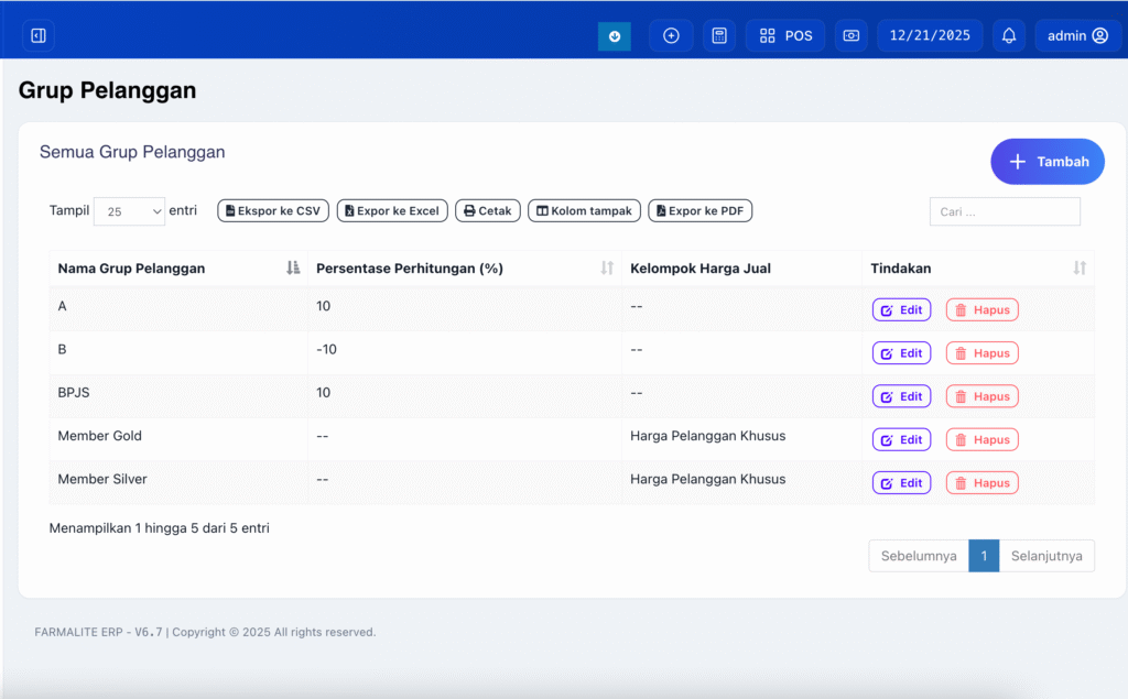 Pada halaman Grup Pelanggan, ditampilkan informasi berikut: