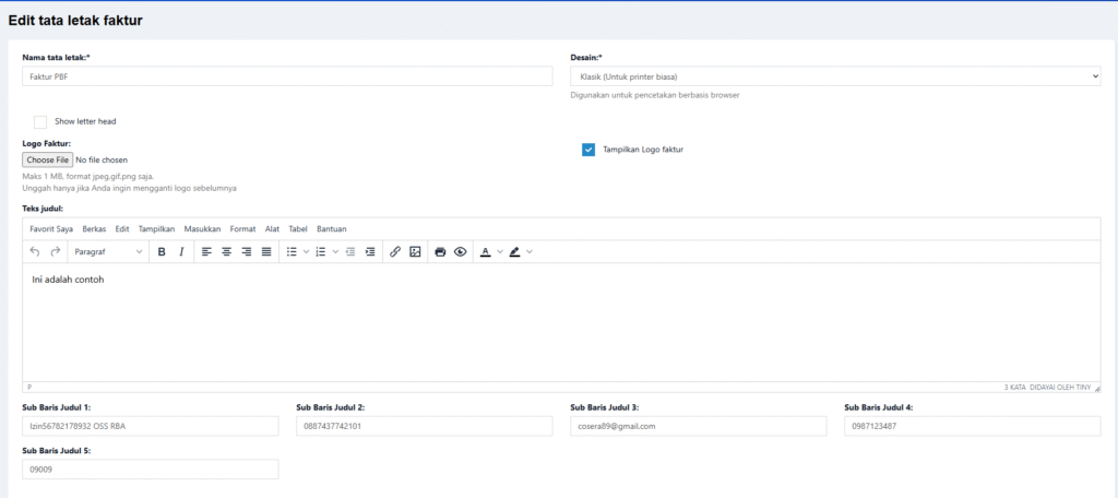 Bagian ini mengatur tampilan fisik faktur saat dicetak.
