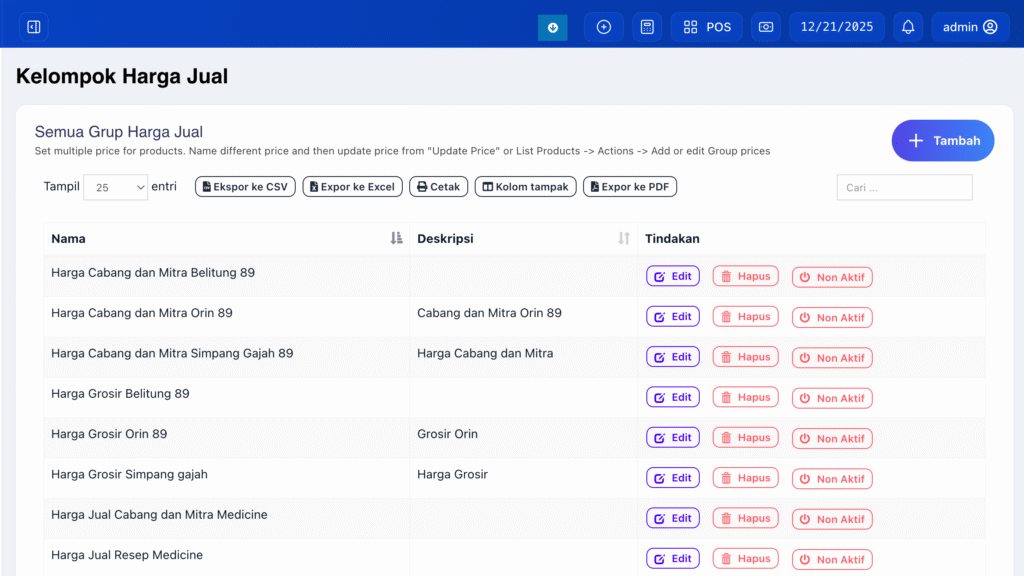 → Hapus: menghapus grup harga (⚠️ disarankan hanya jika tidak dipakai produk)