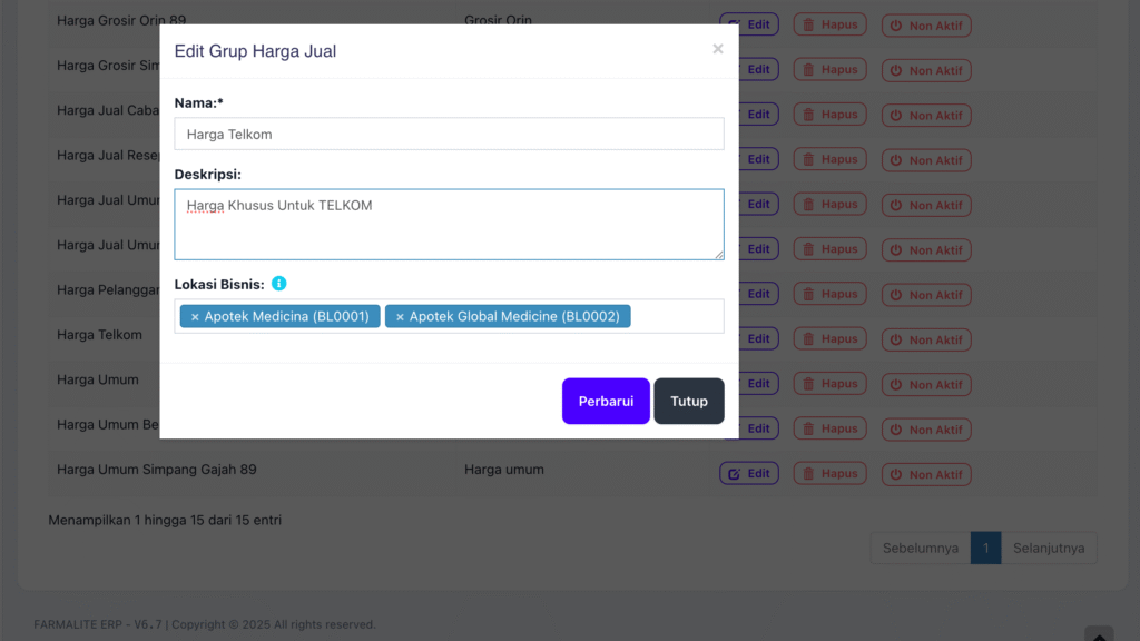 Kelompok Harga Jual digunakan untuk membentuk harga jual yang berbeda-beda untuk produk yang sama, tergantung jenis pelanggan, lokasi bisnis, atau skema penjualan. Fitur ini sangat penting untuk bisnis apotek, distributor, maupun retail yang memiliki harga umum, harga grosir, harga mitra, atau harga khusus pelanggan tertentu.